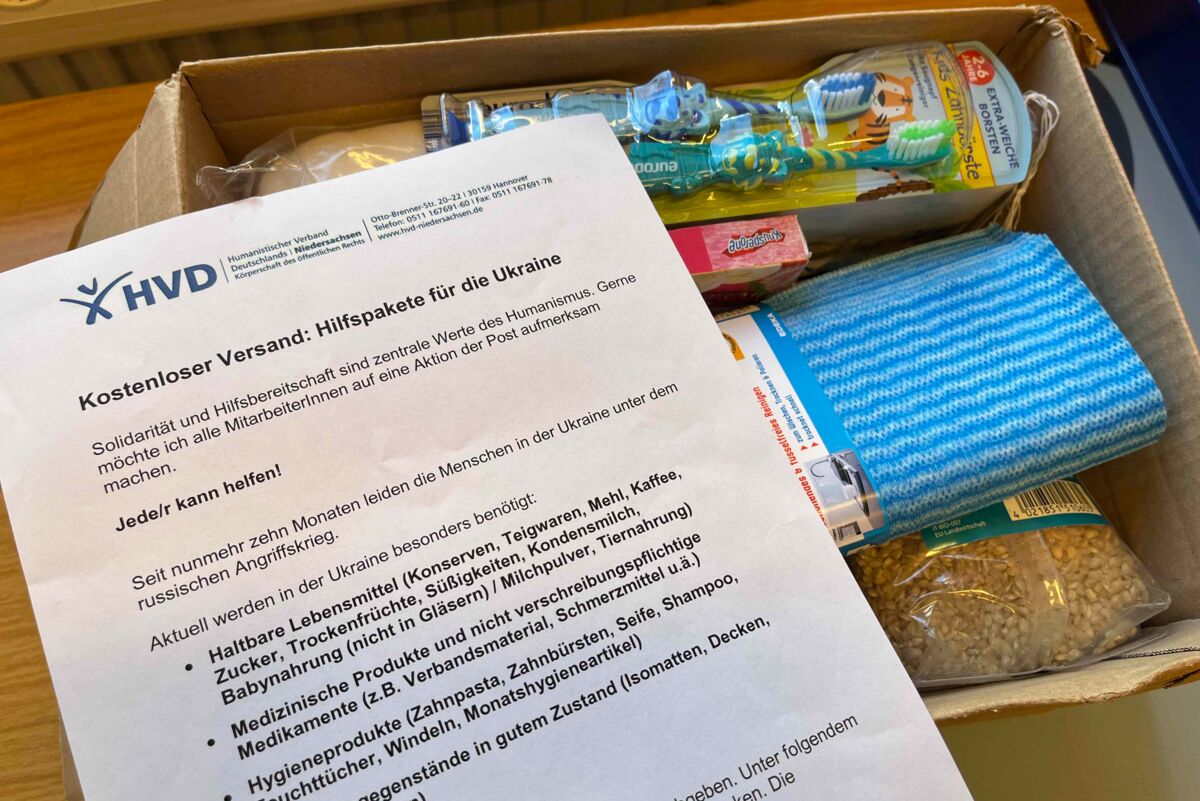 Hygieneprodukte, Verbandsmaterial, Lebensmittel: Den Menschen in der Ukraine fehlt es derzeit an vielem. DHL hat bereits im vergangenen Jahr eine Aktion ins Leben gerufen, bei der Pakete gepackt und kostenlos versandt werden können. Der HVD Niedersachsen hat gerade sein drittes Paket auf den Weg gebracht.